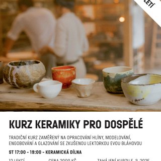 Oblíbený tradiční kurz – relaxujte při práci s hrnčířskou hlínou. Kurz je složen z 12 lekcí, je možné se přihlásit pouze na celý kurz (není možné platit si jednotlivé lekce zvlášť). Výuka probíhá v učebně keramiky v budově Zámku (dveře v průchodu z nádvoří směrem k hlavní silnici).