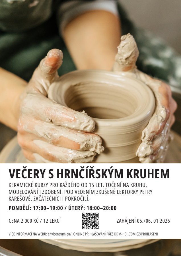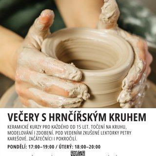 Pojďte si zpříjemnit dlouhé zimní večery a zahřát se u hrnčířského kruhu. Na naše kurzy může přijít každý, koho baví práce s keramickou hlínou. Hlavní náplní bude točení na kruhu, ale prostor dostane i modelování a tvorba z plátů. Začátečníky provedeme všemi kroky, pokročilí si mohou dál rozvíjet své dovednosti a pustit se i do náročnějších projektů, například do výroby čajové konvičky. Hotové výrobky následně ozdobíme – především pomocí engob, glazur a oxidů.