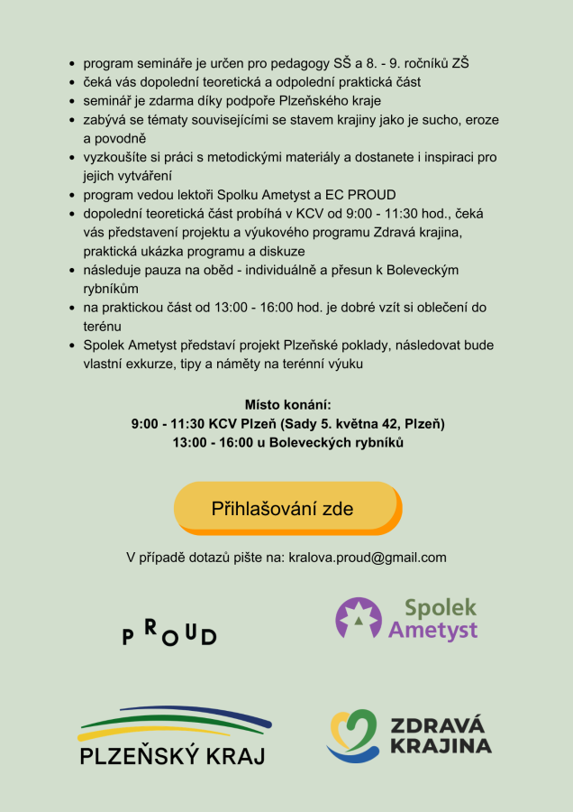 Seminář je díky podpoře Plzeňského kraje zdarma pro učitele z organizací sídlících v Plzeňském kraji a je součástí projektu S krajem do přírody.