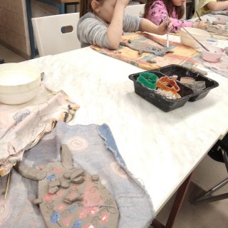 - Propracování hlíny – seznámení s hlínou, propracování hlíny – mačkání, společné “bubnování“ – vytvoření placičky z hlíny;